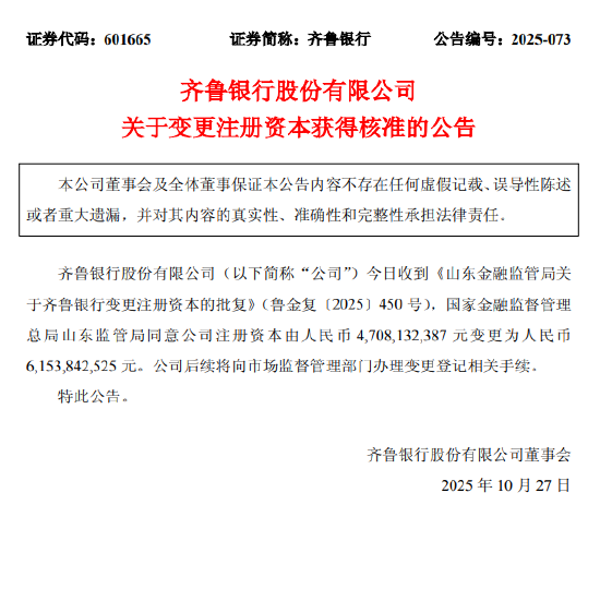 10月27日金融一线消息,齐鲁银行公告称,公司今日收到《山东金融监管局关于齐鲁银行变更注册资本的批复》(鲁金复〔2025〕450 号),国家金融监督管理总局山东监管局同意公司注册资本由人民币 4,708配资门户首页地址,132,387 元变更为人民币6,153,842,525 元。公司后续将向市场监督管理部门办理变更登记相关手续。